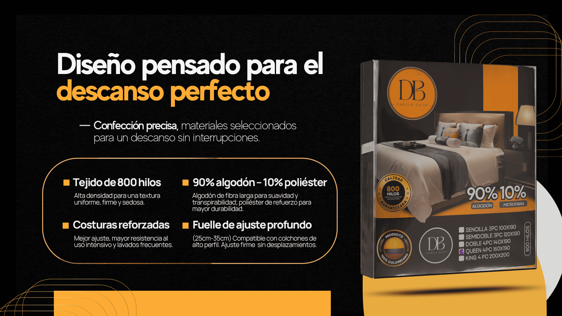 Las sábanas Dabela Premium 800 hilos están confeccionadas con un tejido satinado de alta densidad, que combina 90% algodón y 10% poliéster técnico. Esta composición garantiza una mayor durabilidad, menor formación de arrugas y una textura consistentemente suave al tacto.